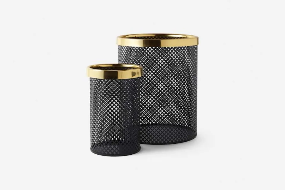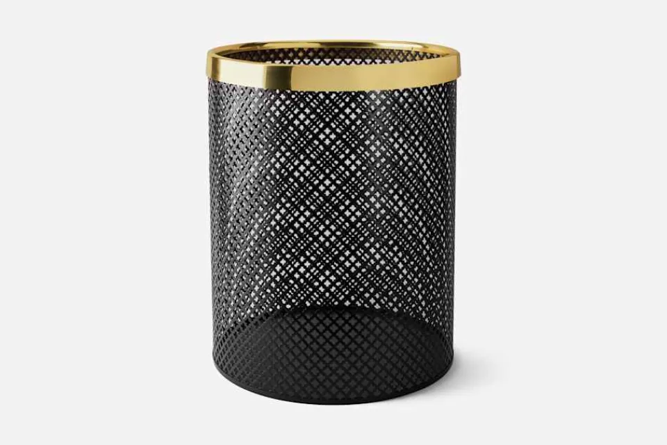 Mönstret på denna papperskorg är inspirerat av den historiska gotiska fyrpassformen, men här har Josef Frank istället för relief utstansat hål i cylinderns plåt. Typiskt för Josef Franks formgivning är också blandningen av material: kroppens lackerade plåt mot överkantens blankpolerade mässingsram.