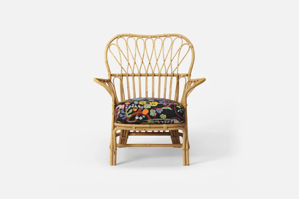 Dyna som passar till Fåtölj 311 klädd i textil Baranquilla svart. Baranquilla fick sitt namn efter den colombianska hamnstaden vid det Karibiska havet, som Josef Frank och hans fru Anna passerade under exilen från Sverige till Amerika 1941, mitt under brinnande världskrig.