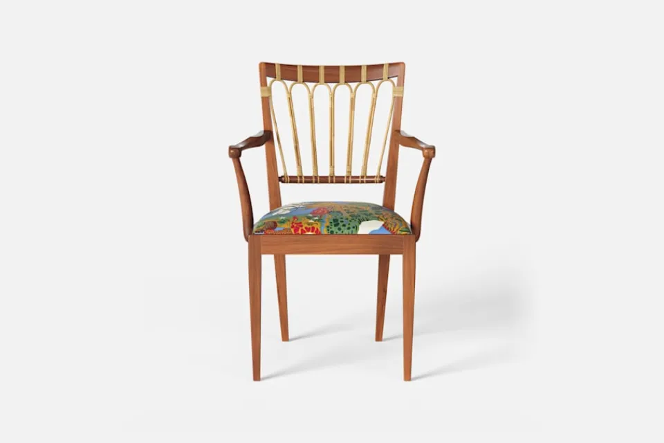 Efter sin återkomst till Stockholm från New York år 1946, formgav Josef Frank denna eleganta karmstol. Stolen har en genombruten rygg bestående av lindad rotting. För att skapa spänning i formen valde Josef Frank ofta att blanda olika träslag och material.
