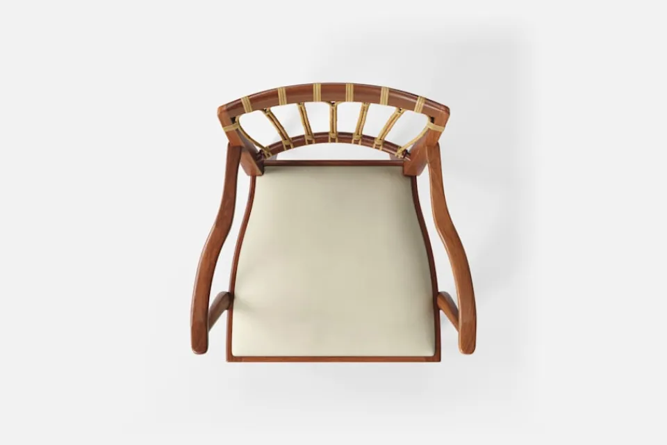 Efter sin återkomst till Stockholm från New York år 1946, formgav Josef Frank denna eleganta karmstol. Stolen har en genombruten rygg bestående av lindad rotting. För att skapa spänning i formen valde Josef Frank ofta att blanda olika träslag och material.