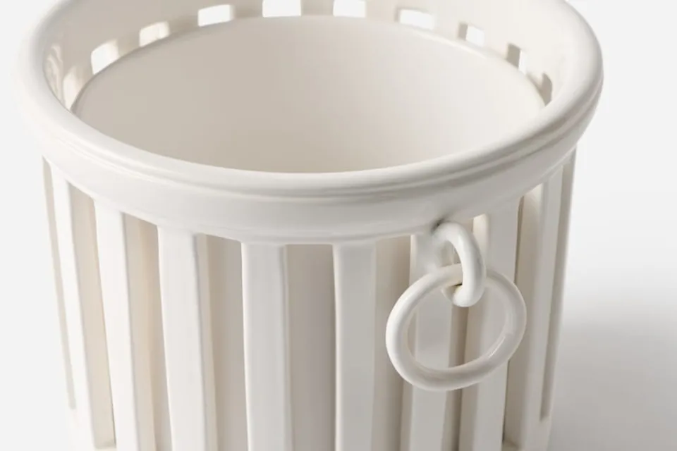 En vacker, vit kruka i klassisk empirstil från franska Bourg Joly Malicorne. Krukan består av en lös, avtagbar innerkruka samt ett ytterfoder. Den tillverkas för hand i Malicorne sur Sarthe i Frankrike.