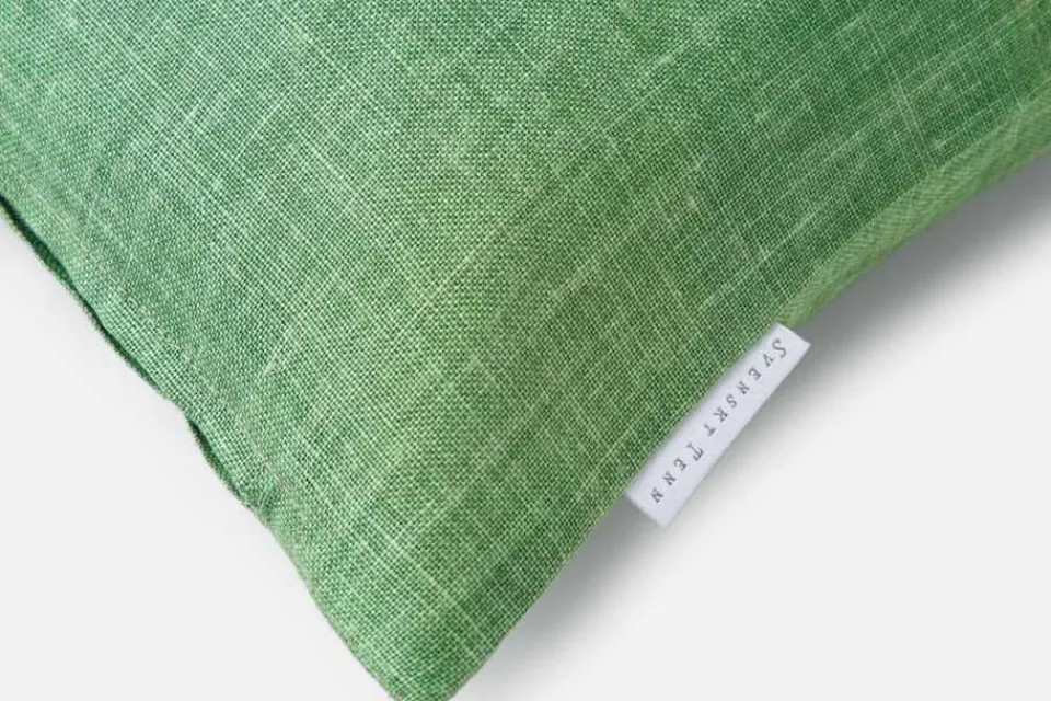 Kudde i Svenskt Tenns eget, enfärgade linnetyg i jadegrön. Kudden kan kombineras såväl med enfärgade som mönstrade kuddar och textilier.