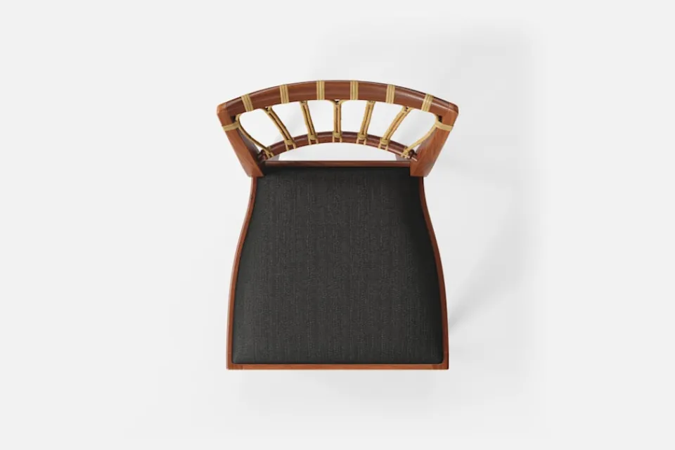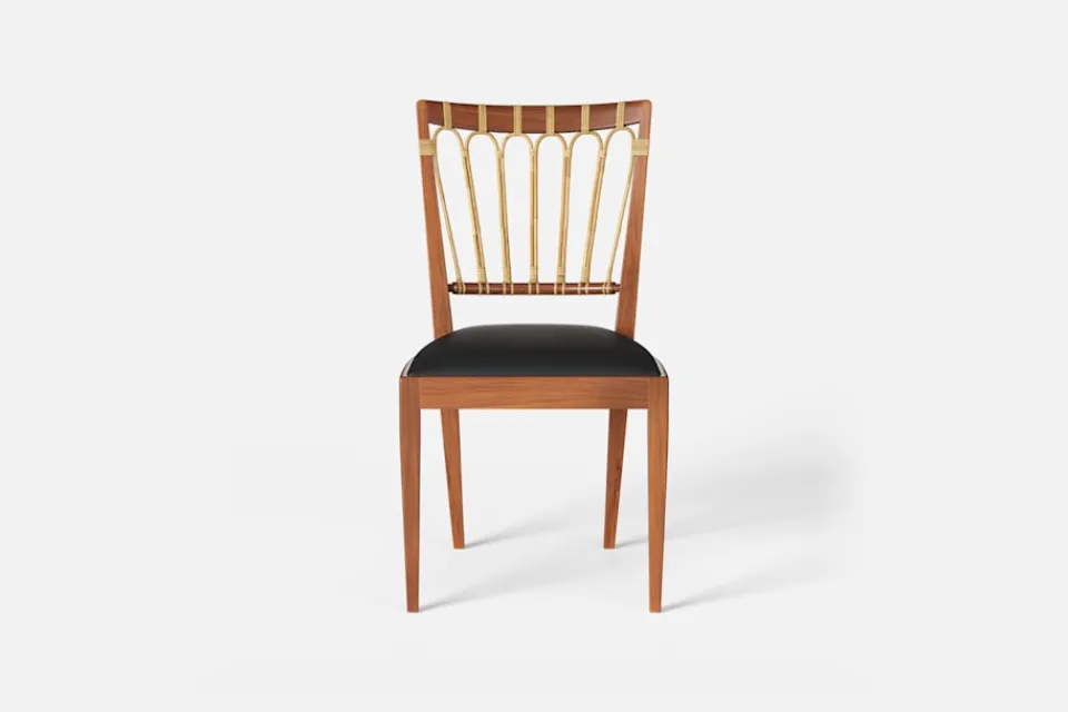 Stol 1165 har en genombruten rygg bestående av lindad rotting. För att skapa en spänning i formen valde Josef Frank ofta att blanda olika träslag och material. Stol 1165 formgavs av Josef Frank 1947.