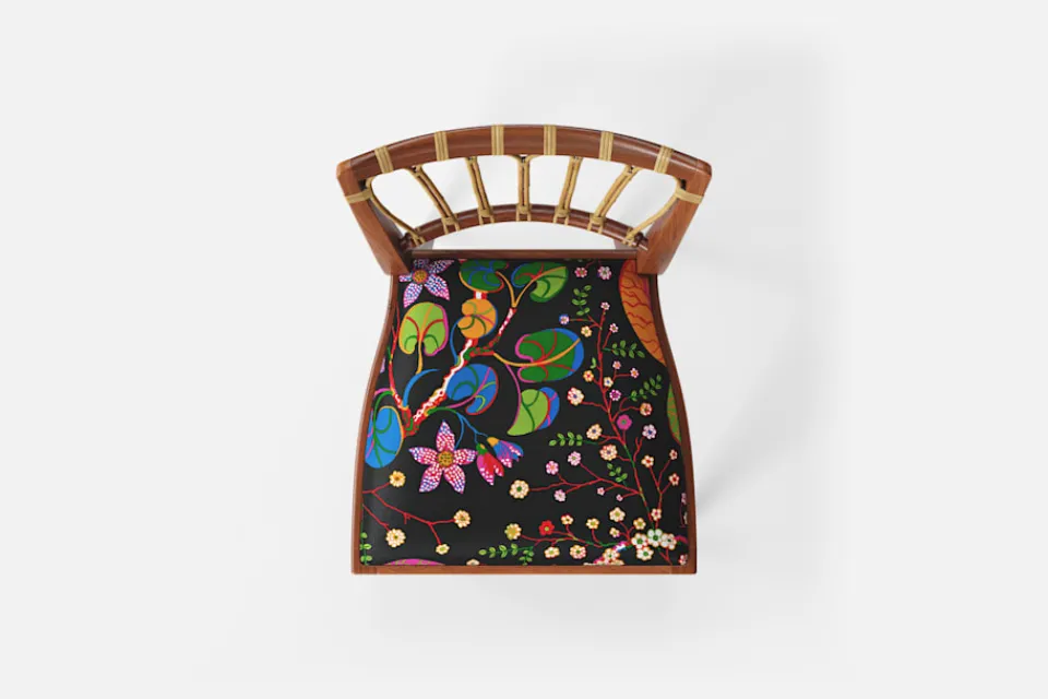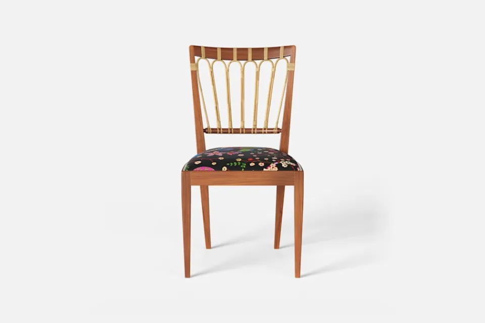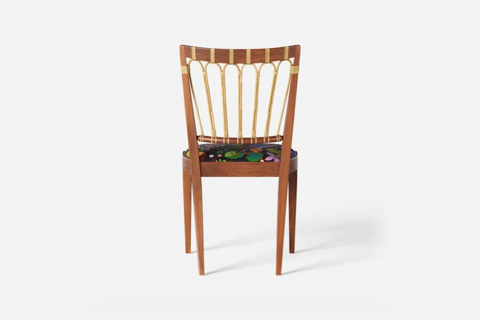 Stol 1165 har en genombruten rygg bestående av lindad rotting. För att skapa en spänning i formen valde Josef Frank ofta att blanda olika träslag och material. Stol 1165 formgavs av Josef Frank 1947.