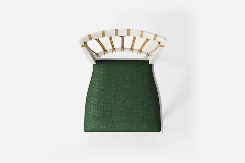 Stol 1165 har en genombruten rygg bestående av lindad rotting. För att skapa en spänning i formen valde Josef Frank ofta att blanda olika träslag och material. Stol 1165 formgavs av Josef Frank 1947.