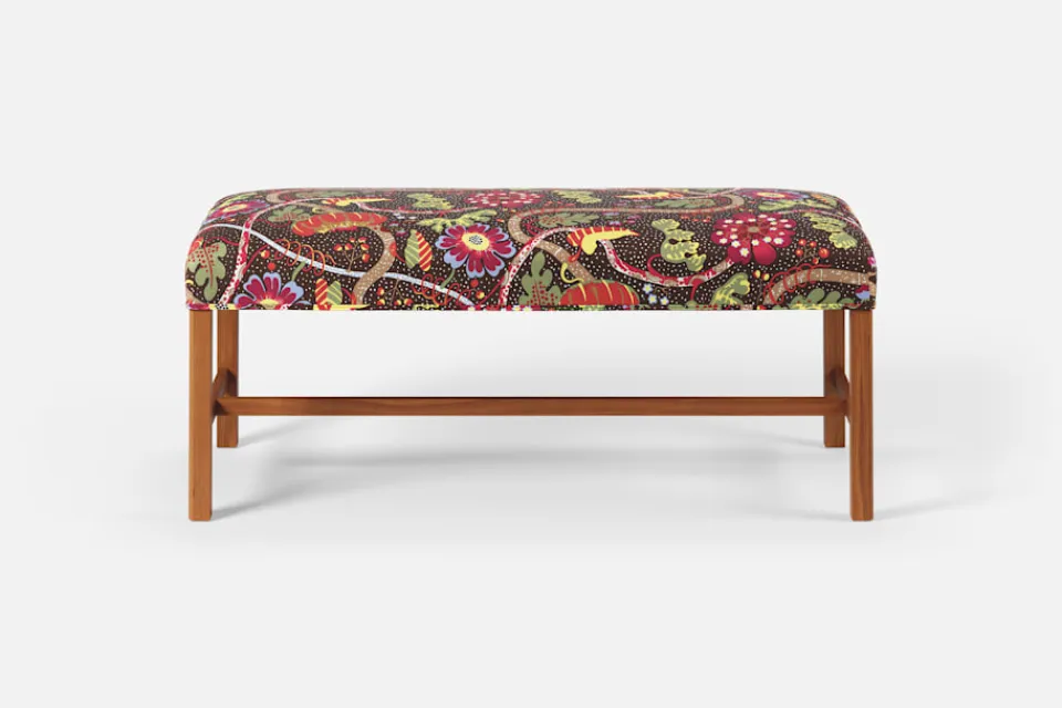 Denna rektangulära, stramt utformade pall med sits i tyg eller skinn formgavs av Josef Frank år 1950. De fyrkantiga benen har den typiska hörnprofileringen som kännetecknar Josef Franks formgivning. Benställningens H-kryss för tankarna till 1700-talets möbelformgivning.