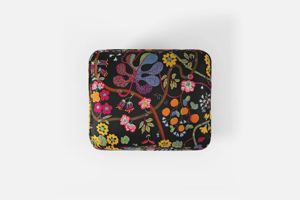 Denna fotpall formgavs av Josef Frank år 1936 tillsammans med fåtölj 568. Den generösa sittplymån under dynan och de facetterade nedåt avsmalnande benen är typiska för Josef Franks formspråk.