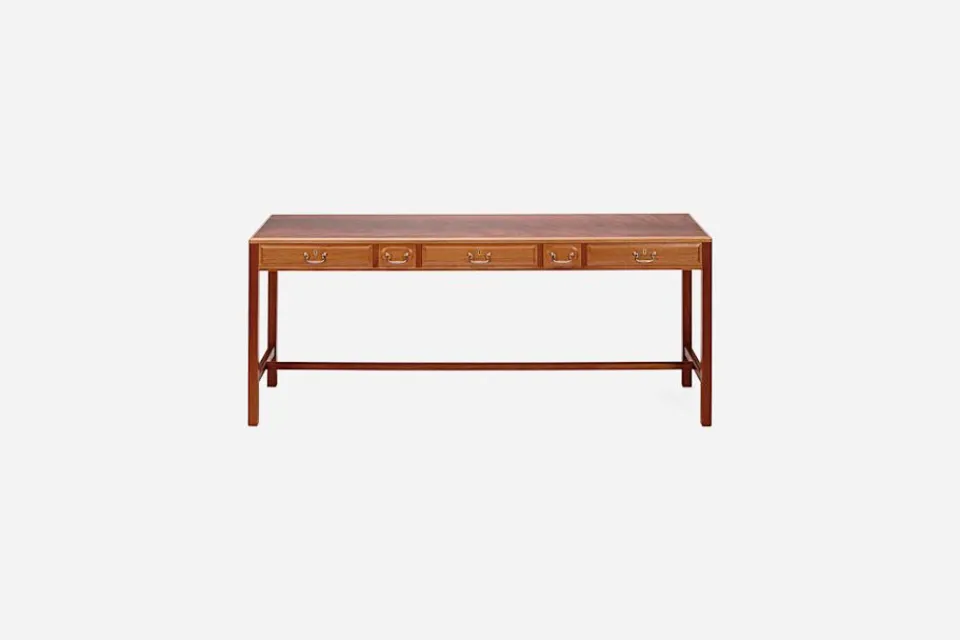 Benställning i mahogny med fanerad bordsskiva av pyramidmahogny. Bordet inramas av en smal intarsia av björk. Lådorna pryds med beslag i blankpolerad mässing, varav de tre större lådorna är låsbara.