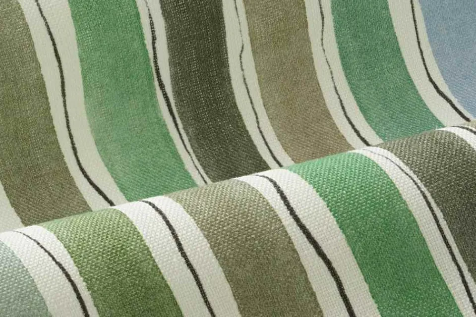 Textil Wisteria smyckas av målade ränder i blågröna toner, inspirerade av blommande blåregn i trädgården som omger Villa San Michele på Capri. Mönstret är formgivet av designern Lars Nilsson för Svenskt Tenn, och finns även i en annan färgställning vid namn Anacapri.
