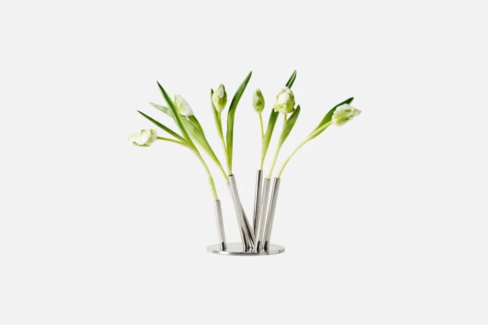 Med sina utstickande pipor sätter sig blommorna vackert i förhållande till varandra, vilket säkert var den tidiga funktionalistformgivaren Nils Fougstedts tanke när han formgav vasen i tenn. Uttrycket känns modernt trots att den formgavs redan 1931.