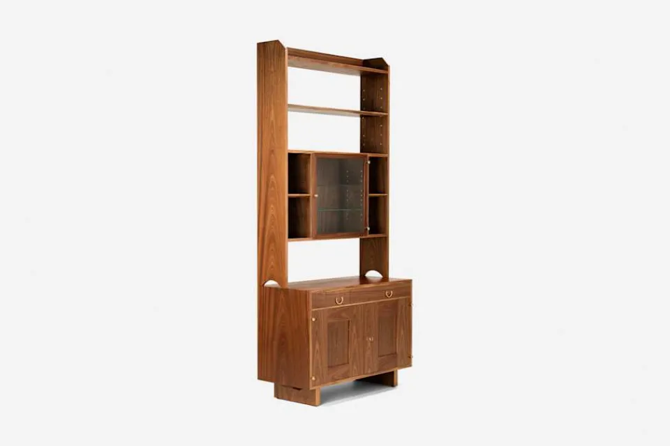 Den klassiska bokhyllan 2112 i mahogny formgavs av Josef Frank för Svenskt Tenn 1950.