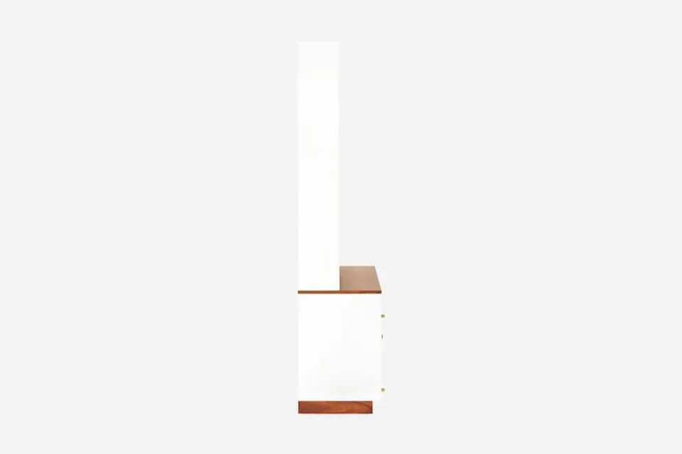 Att blanda olika material var typiskt för Josef Franks formgivning. I bokhylla 2255 möter stommens vitlackering och ryggens gröna färg, skivan och beslagsskyltarna i valnöt. Bokhylla 2255 formgavs av Josef Frank år 1943.