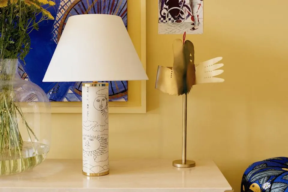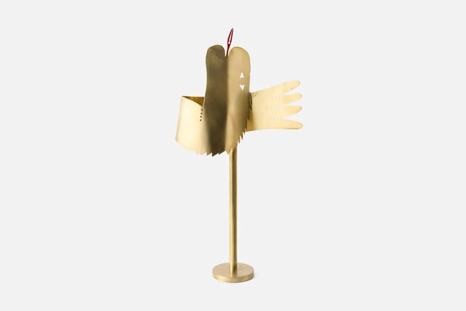 Unik bordslampa i form av en drake i mässing, skapad av den grekiske konstnären Alekos Fassianos. Fassianos var känd för sina skildringar av mytologiska motiv och karaktäristiska gestalter. Han levde och verkade mellan Aten och Paris, och skapade ett konstnärligt universum som överskred såväl geografiska som tidsmässiga gränser. Svenskt Tenn säljer endast lampan i ett exemplar. Bordslampan finns tillgängligt i två exemplar och kan sedan beställas under en begränsad period på Svenskt Tenn.