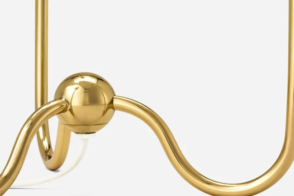 Denna trearmade bordslampa i mässing är formgiven av Josef Frank. I originalteckningen har lampan skärmar i olika färger.