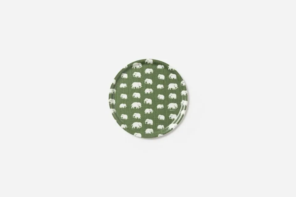 Svenskt Tenns klassiska brickor i björkfaner finns i flera färgstarka mönster av Josef Frank och Estrid Ericson, bland annat mönstret Elefant. Svenskt Tenns grundare reste mycket till olika platser runt om i världen. Hon letade alltid efter vackra föremål, textilier och souvenirer att ta hem och sälja i butiken på Strandvägen. Det var efter en förlaga från Belgiska Kongo som hon formgav mönstret med de små elefanterna. Svenskt Tenn tryckte textil Elefant för första gången i slutet av 1930-talet. Elefantmönster