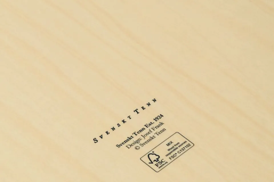 Svenskt Tenns klassiska brickor i björkfaner finns i flera färgstarka mönster av Josef Frank, bland annat Svenskt Tenn Est. 1924. Mönstret Svenskt Tenn Est. 1924 gick ursprungligen under namnet “Stockholm” när det formgavs av Josef Frank omkring 1949 – 1950. Motivet visar en Stockholmskarta, med utvalda platser som Folkungagatan, Karlavägen, Drottninggatan och Mynttorget. Till Svenskt Tenns hundraårsjubileum 2024 har texten Svenskt Tenn Est. 1924 adderats i textremsorna som flätar samman motivet: en hyllning till de 100 år under vilka företaget funnits och verkat i centrum av den svenska och internationella designscenen.