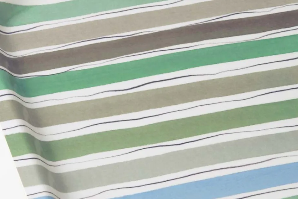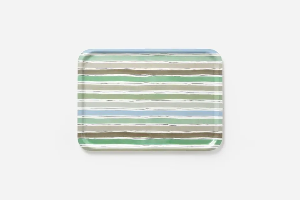 En fin frukostbricka till vår och sommar, med blågrönt mönster av Lars Nilsson för Svenskt Tenn. De målade ränderna är inspirerade av blommande blåregn i trädgården som omger Villa San Michele på Capri.