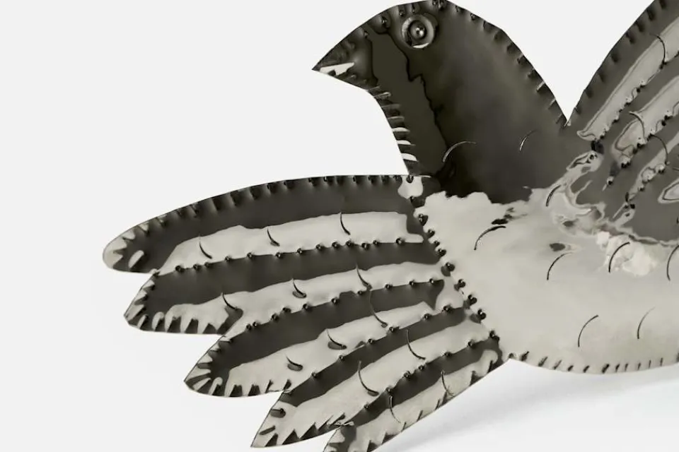 Denna upphängningsbara dekorationsfågel i silver är skapad efter ett verk av grekiske konstnären Alekos Fassianos. Fågeln är karaktäristiskt och återkommande motiv i Fassianos konstnärliga verk, som för honom symboliserade frihet.