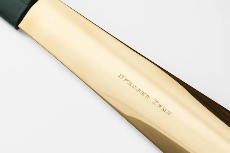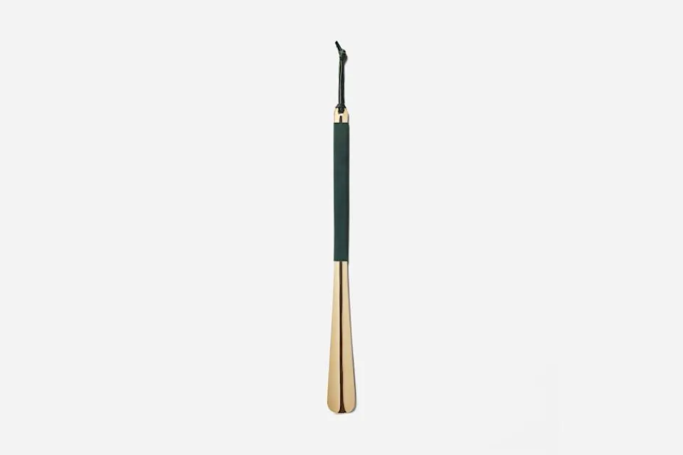 Ett skohorn i läder och mässing, formgivet av Daniel Enoksson för Svenskt Tenn. Mötet mellan det mjuka, varma lädret och den blanka mässingen som ärgas med tiden, ger skohornet en lång livslängd. Ett vackert och funktionellt föremål, skapad med tidlösa och traditionella material.