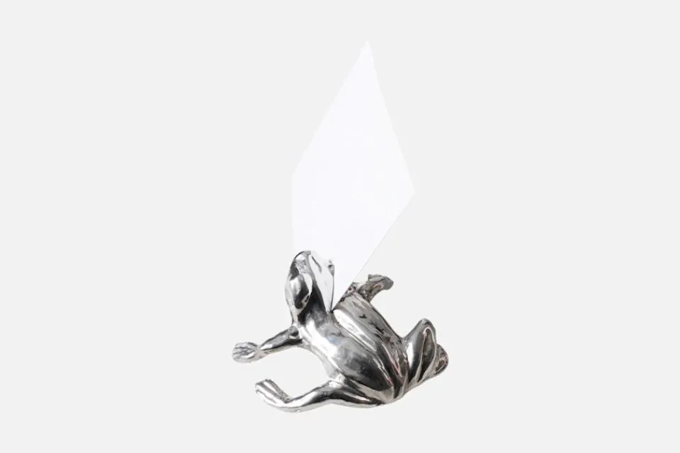 Placeringskortsgrodan i tenn är Svenskt Tenns egen design efter en förebild formgiven av Estrid Ericson, som använde den lilla grodan som bordsdekoration.