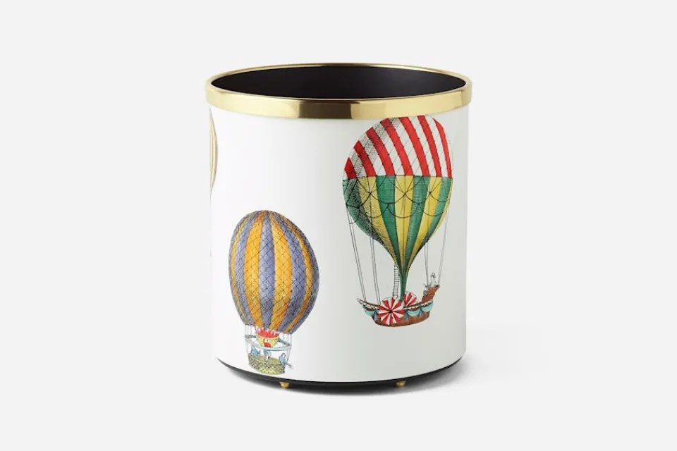 En dekorativ papperskorg med Fornasettis karaktäristiska illustrationer i lackerad plåt. Mönstret Palloni (ballonger på svenska), skildrar flygande, färgstarka luftballonger mot vit bakgrund. Samtliga Fornasettis kreationer, från möbler till inredningsdetaljer, tillverkas för hand i Italien. I företagets ateljé arbetar skickliga hantverkare med samma tekniker som användes när de allra första produkterna togs fram. Färgen appliceras för hand med utgångspunkt i originalmönstren.