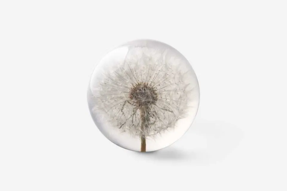 I denna dekorativa brevtyngd står den vardagliga men vackra och mångfacetterade maskrosen i fokus. Blomman har varsamt kapslats in i klar polyesterharts innehållandes ett bevarande UV-filter som inte skadar växten. Den runda formen gör att man kan uppleva dess skönhet från alla vinklar.