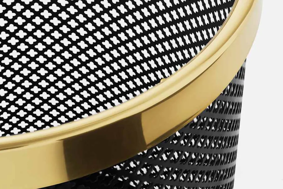Mönstret på denna papperskorg är inspirerat av den historiska gotiska fyrpassformen, men här har Josef Frank istället för relief utstansat hål i cylinderns plåt. Typiskt för Josef Franks formgivning är också blandningen av material: kroppens lackerade plåt mot överkantens blankpolerade mässingsram.