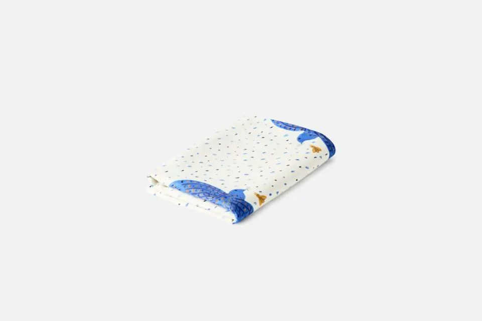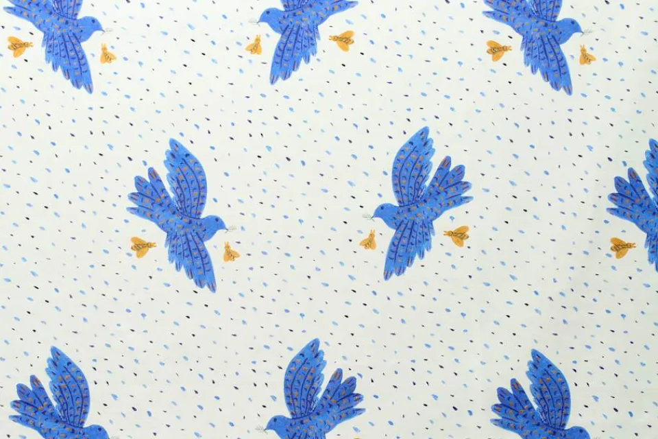 En vacker linneduk med motiv av blå fåglar, skapat av den grekiske konstnären Alekos Fassianos. I sina verk skapade Fassianos ofta rörelse i motivet genom att skildra vinden, vingar och flygande fåglar. I detta mönster syns två av hans återkommande motiv såsom fågeln och biet. Tillsammans visar de det poetiska formspråk som var så karaktäristiskt för Fassianos, och som för honom symboliserade frihet.