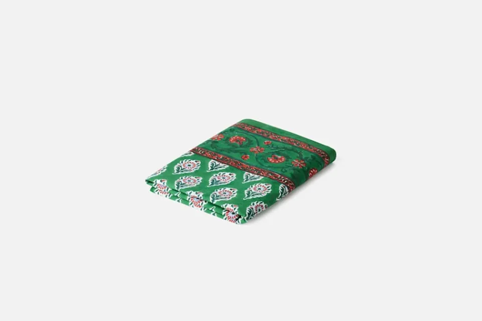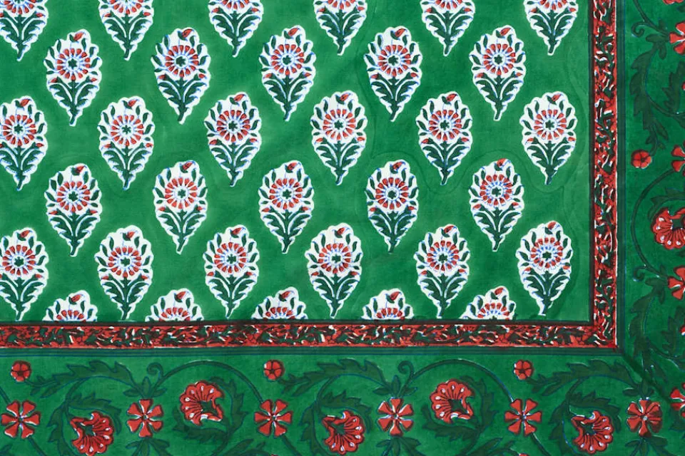 En grön duk i mjukt bomullstyg som smyckas av vackra, blocktryckta blommor i röda och gröna toner. Textilen trycks för hand på ett litet, familjeägt företag i Jaipur, Indien. Mönsterblocket skärs ur ett träblock, doppas sedan i färg och trycks mot tyget som en stämpel. Blocktrycket är en konstform; en tillverkningsmetod som kräver enorm precision och hantverksskicklighet.