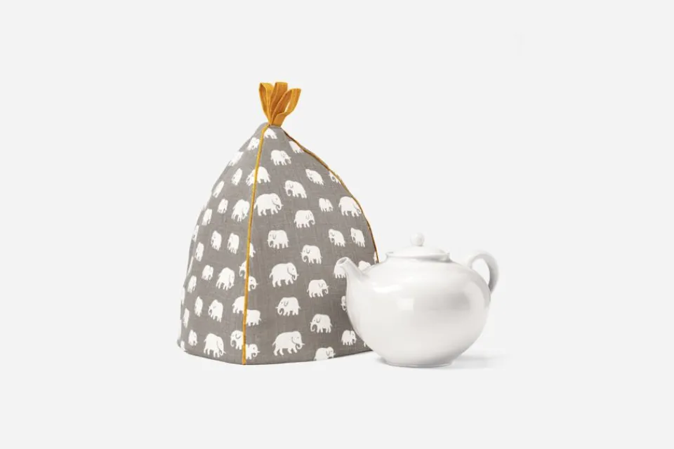 Svenskt Tenns tehuva med mönstret Elefant, dekorerar varje kök eller dukning. Den runda huvan håller tekannan, brödkorgen eller frukostäggen varma. Svenskt Tenns grundare Estrid Ericson reste mycket till olika platser runt om i världen. Hon letade alltid efter vackra föremål, textilier och souvenirer att ta hem och sälja i butiken på Strandvägen. Det var efter en förlaga från Belgiska Kongo som hon formgav mönstret med de små elefanterna. Svenskt Tenn tryckte textil Elefant för första gången i slutet av 1930-talet.