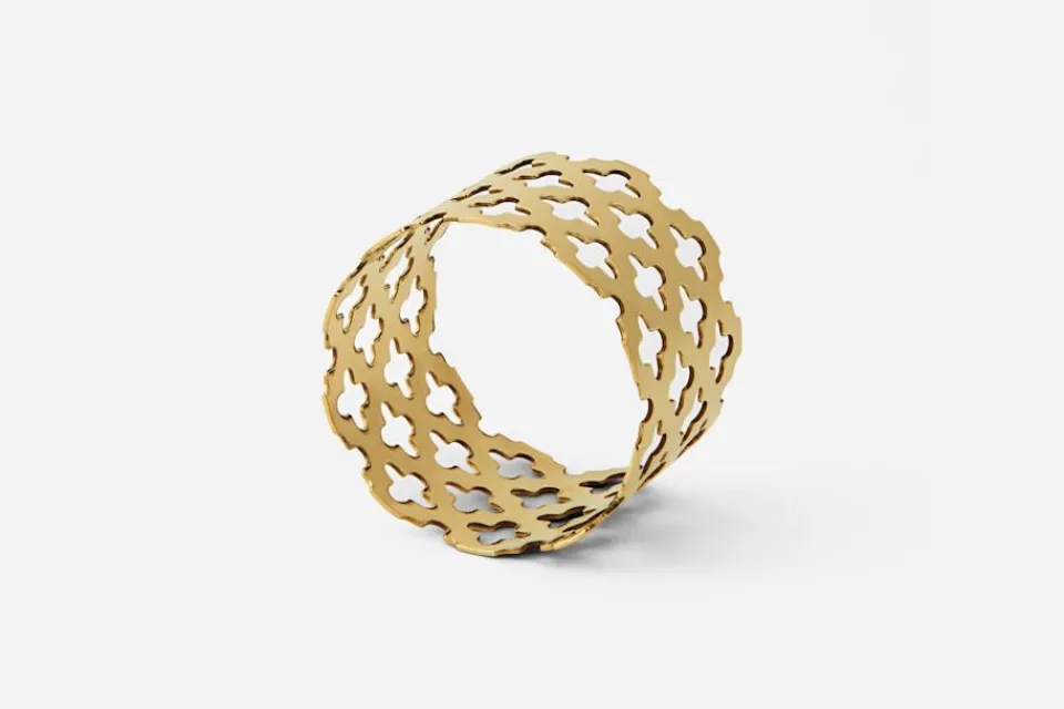 Svenskt Tenns dekorativa servettring i mässing är formgiven av Sara Szyber. Servettringen bär klövermönstret som återfinns på flera produkter i sortimentet.