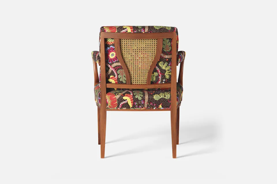 Med inspiration från 1700-talets nätta karmstolar formgav Josef Frank karmstol 969. För att skapa spänning i formgivningen valde Josef Frank ofta att blanda olika träslag och material. Karmstol 969 är gjord i mahogny med infällning av rotting i ryggen bakom den löstagbara kudden. Stolen formgavs 1939 och finns i två olika sitthöjder.