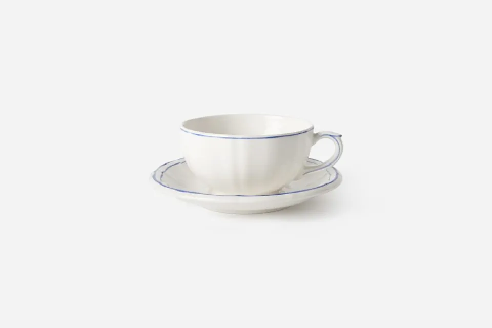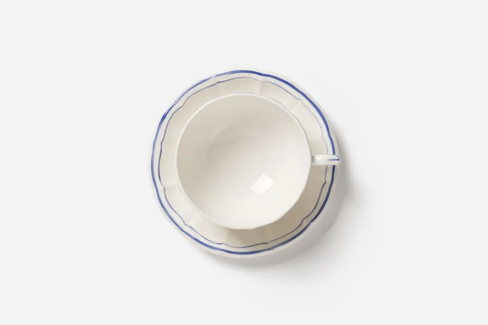 En enkel, klassisk och elegant servis från franska Gien. Den skira blåa kantlinjen är handmålad på varje porslinsföremål.
