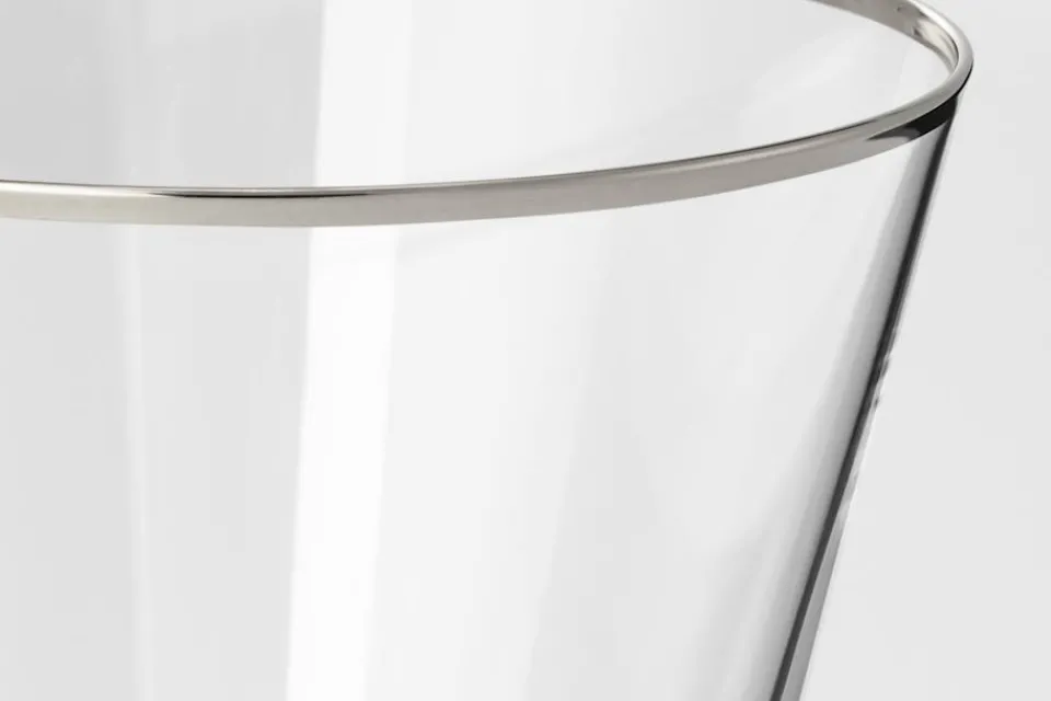 Svenskt Tenns eleganta vinglas med silverkant är en del av serien med vatten- och whiskyglas som formgavs av Svenskt Tenn på 1980-talet. De exklusiva vinglasen lanserades som komplement till serien under sommaren 2017.