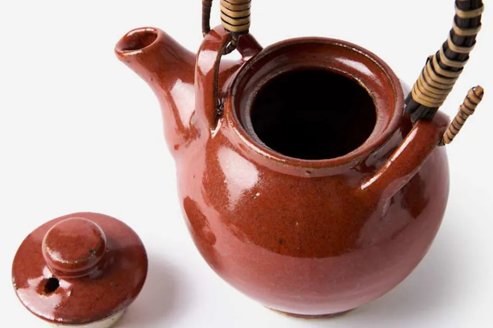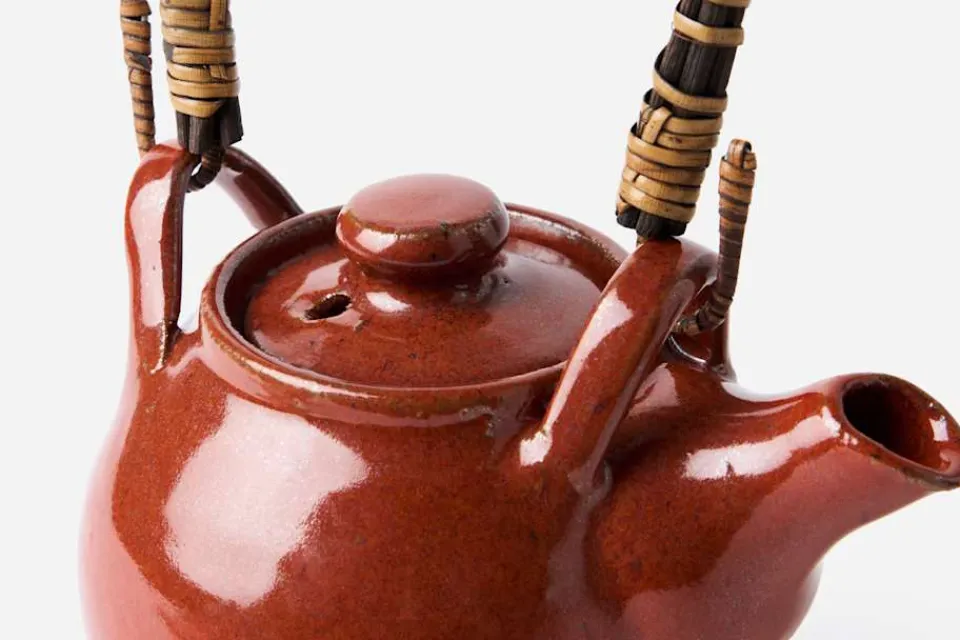 Tidlös, röd tekanna med handtag i bambu, formgiven och tillverkad för hand av keramikern Calle Forsberg i verkstaden i Saltsjö-Boo. Tekannan rymmer 0,6 liter.