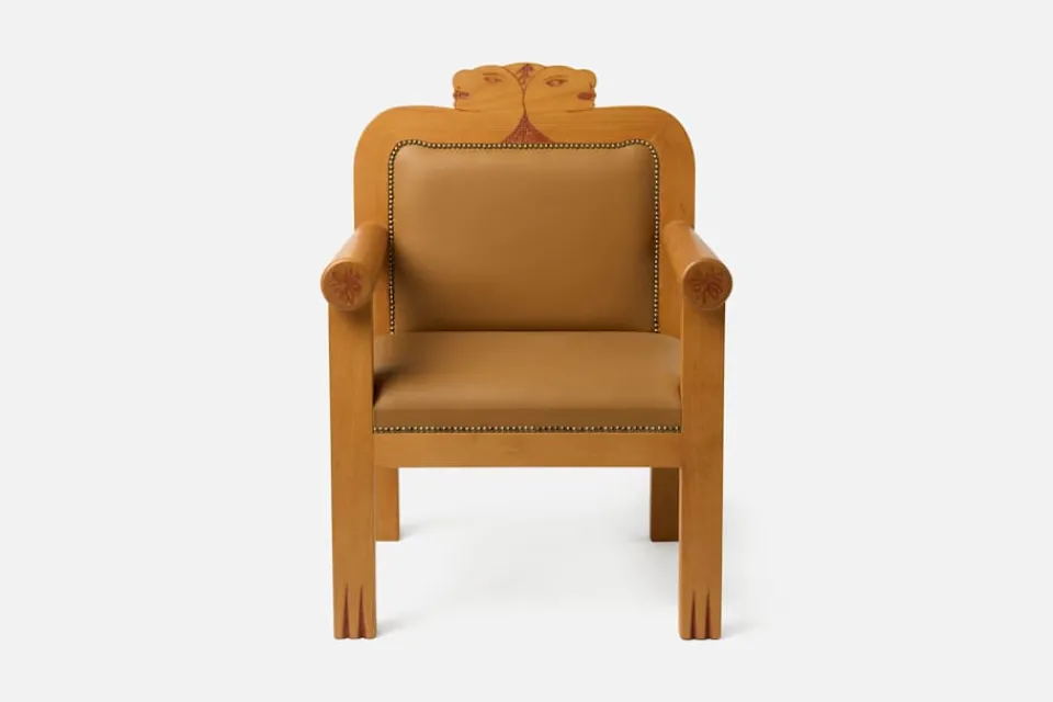 En vacker karmstol av Alekos Fassianos med konstnärens motiv avbildat i stolsryggen. Stolen är tillverkad i trä med lädersits. Den finns tillgängligt i ett exemplar och kan sedan beställas under en begränsad period på Svenskt Tenn.