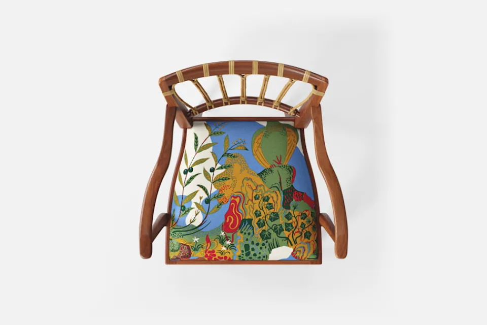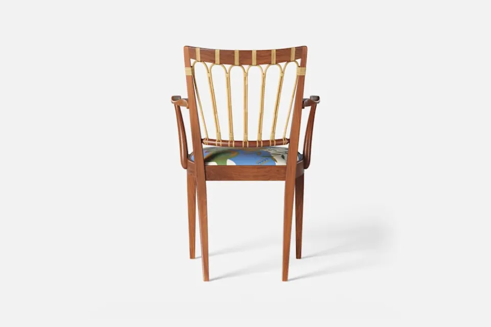 Efter sin återkomst till Stockholm från New York år 1946, formgav Josef Frank denna eleganta karmstol. Stolen har en genombruten rygg bestående av lindad rotting. För att skapa spänning i formen valde Josef Frank ofta att blanda olika träslag och material.