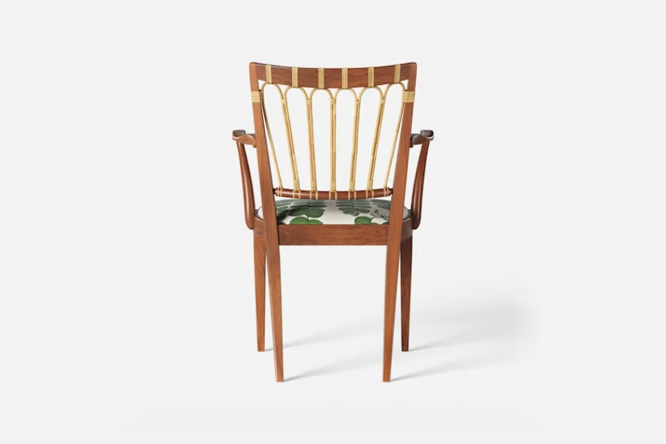 Efter sin återkomst till Stockholm från New York år 1946, formgav Josef Frank denna eleganta karmstol. Stolen har en genombruten rygg bestående av lindad rotting. För att skapa spänning i formen valde Josef Frank ofta att blanda olika träslag och material.