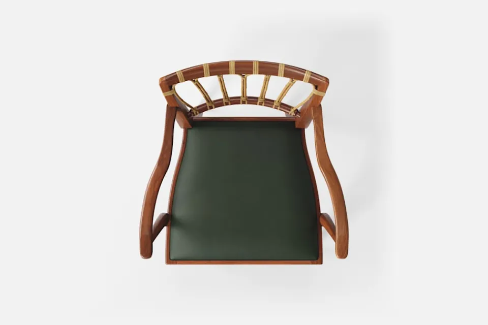 Efter sin återkomst till Stockholm från New York år 1946, formgav Josef Frank denna eleganta karmstol. Stolen har en genombruten rygg bestående av lindad rotting. För att skapa spänning i formen valde Josef Frank ofta att blanda olika träslag och material.