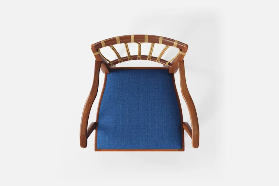 Efter sin återkomst till Stockholm från New York år 1946, formgav Josef Frank denna eleganta karmstol. Stolen har en genombruten rygg bestående av lindad rotting. För att skapa spänning i formen valde Josef Frank ofta att blanda olika träslag och material.