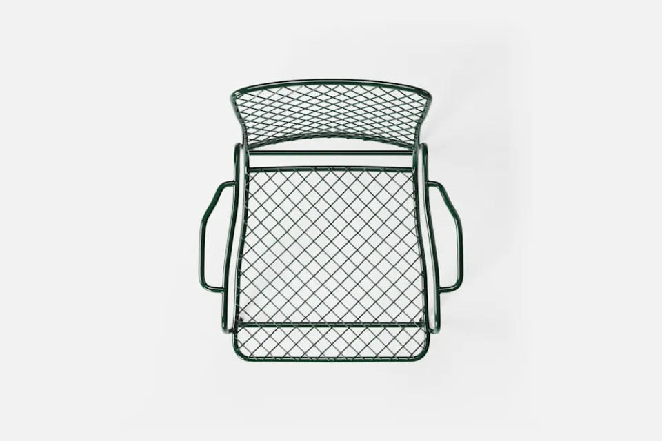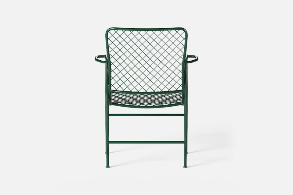 Trädgårdsmöbeln i lackerat järn med genombruten nätdekor i rygg och sits formgavs Josef Frank i mitten av 1930-talet. Den här typen av stålrörsmöbler var populära inom den funktionalistiska stilen som gjort sitt intåg i Sverige. I karmstol 591 har Josef Frank bytt ut det då ofta förekommande kromet mot den varma lackfärgen.