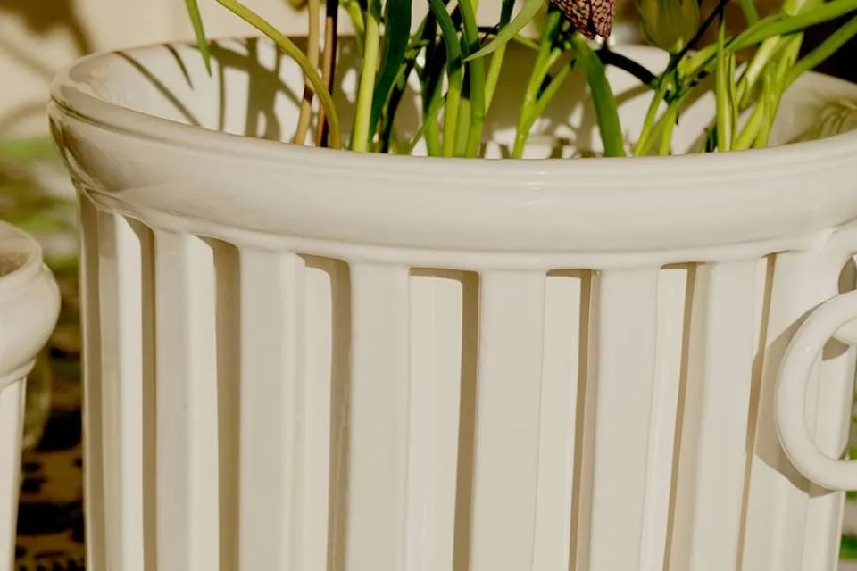 En vacker, vit kruka i klassisk empirstil från franska Bourg Joly Malicorne. Krukan består av en lös, avtagbar innerkruka samt ett ytterfoder. Den tillverkas för hand i Malicorne sur Sarthe i Frankrike.
