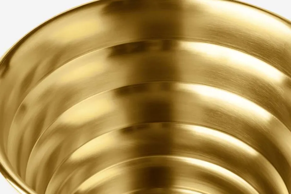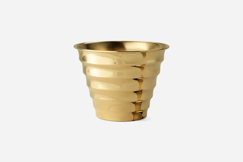 Estrid Ericson reste mycket och samlade under sina resor på sig olika slags saker, former och mönster. Inspiration till formen på denna kruka i mässing med böljande sidor fick Estrid säkert från någon av sina resor.