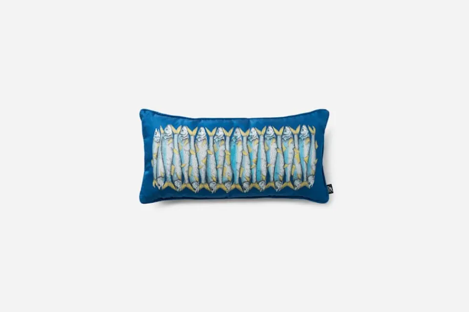 En vacker silkeskudde med sardinmotiv av Fornasetti, tillverkad för hand i Italien. I företagets ateljé arbetar skickliga hantverkare med samma tekniker som användes när de allra första produkterna togs fram.