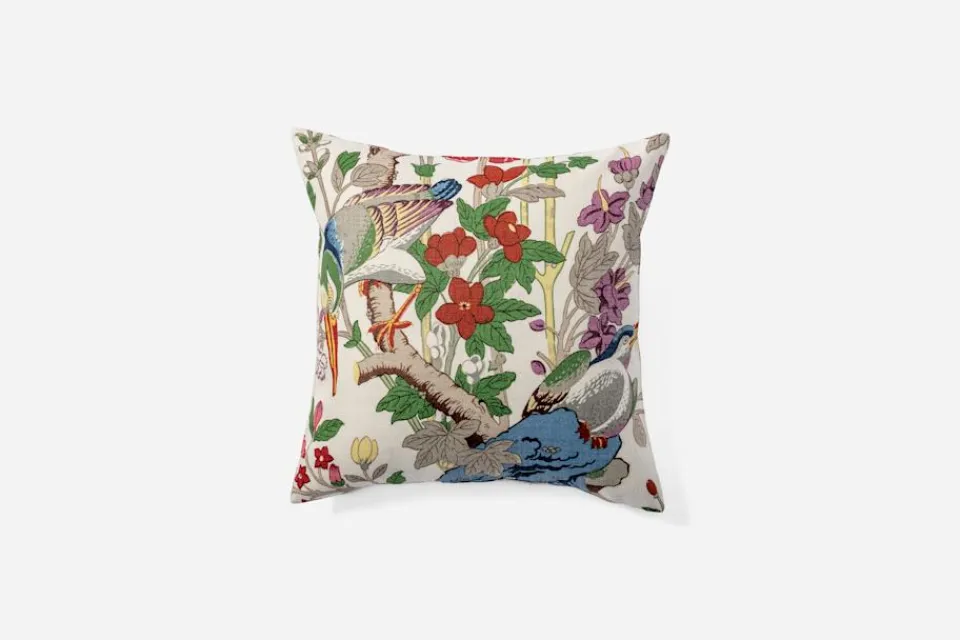 Svenskt Tenns klassiska kuddar är omtyckta världen över; från Stockholm till New York och Shanghai. Svenskt Tenns grundare Estrid Ericson reste mycket till olika platser runt om i världen. Hon letade alltid efter vackra föremål och textilier att ta hem och sälja i butiken på Strandvägen. Textil Toucans kommer från det engelska textilföretaget GP & J Baker, som i sin formgivning ofta hämtade inspiration från historiska mönstertraditioner. Estrid Ericson började köpa in textil från dem redan under 1930-talet. Toucans formgavs av William Turner 1922, och är ett av fem blocktrycksmönster han skapade för GP & J Baker samma år. Turner älskade orientaliskt måleri, och grundelementen i detta motiv har hämtats från en kinesisk tapet i företagets arkiv. Fåglarna här är, trots namnet, inte tukaner. Avsiktliga och humoristiska felaktigheter återkommer i flera av de namn som GP & J Baker givit sina mönster genom åren. Fågeln som tittar ner i motivet kan i verkligheten vara en snäppa, och den som sitter på berget är kanske en ung skarv.