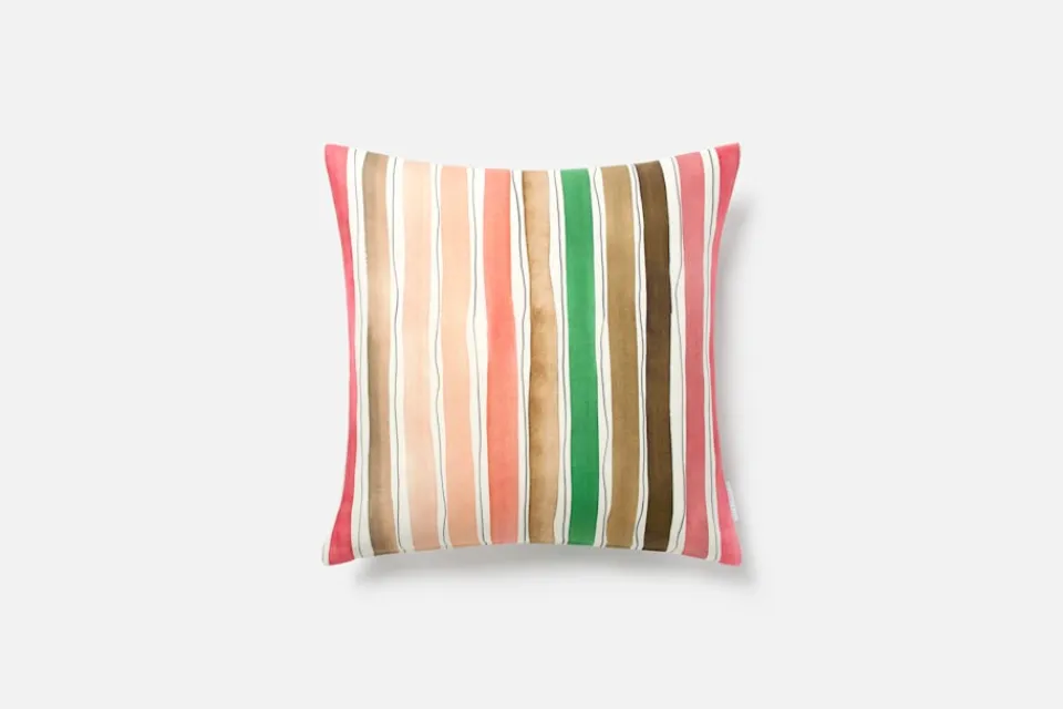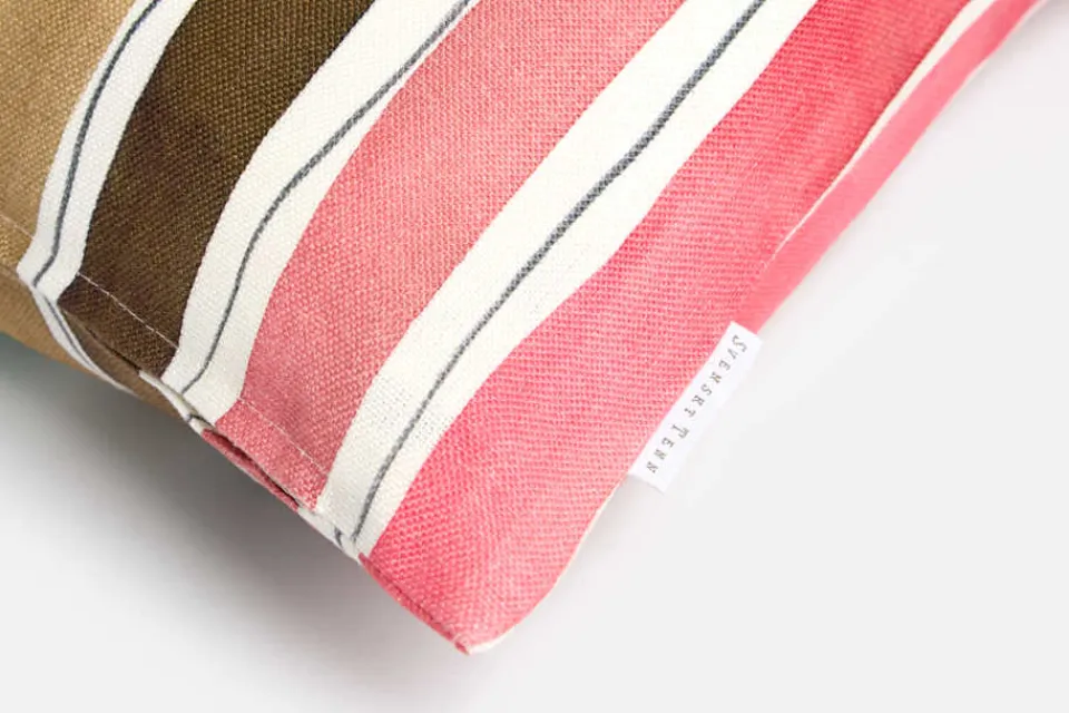 Kudde Anacapri är en del av kollektionen ”Capri”, skapad av designern Lars Nilsson för Svenskt Tenn under våren 2018. Tyget smyckas av målade ränder i varma sommartoner, inspirerade av den blomstrande trädgården som omger Villa San Michele på Capri. Kuddfodralet har en dragkedja i botten och är ett par centimeter mindre för att kudden ska se fyllig och fin ut.