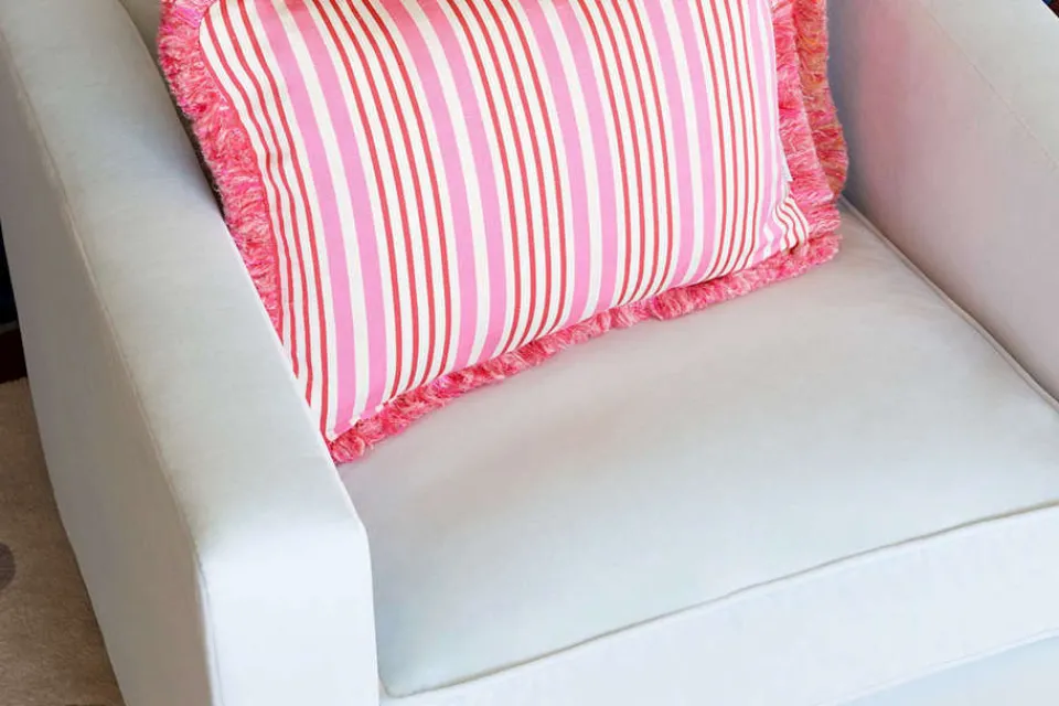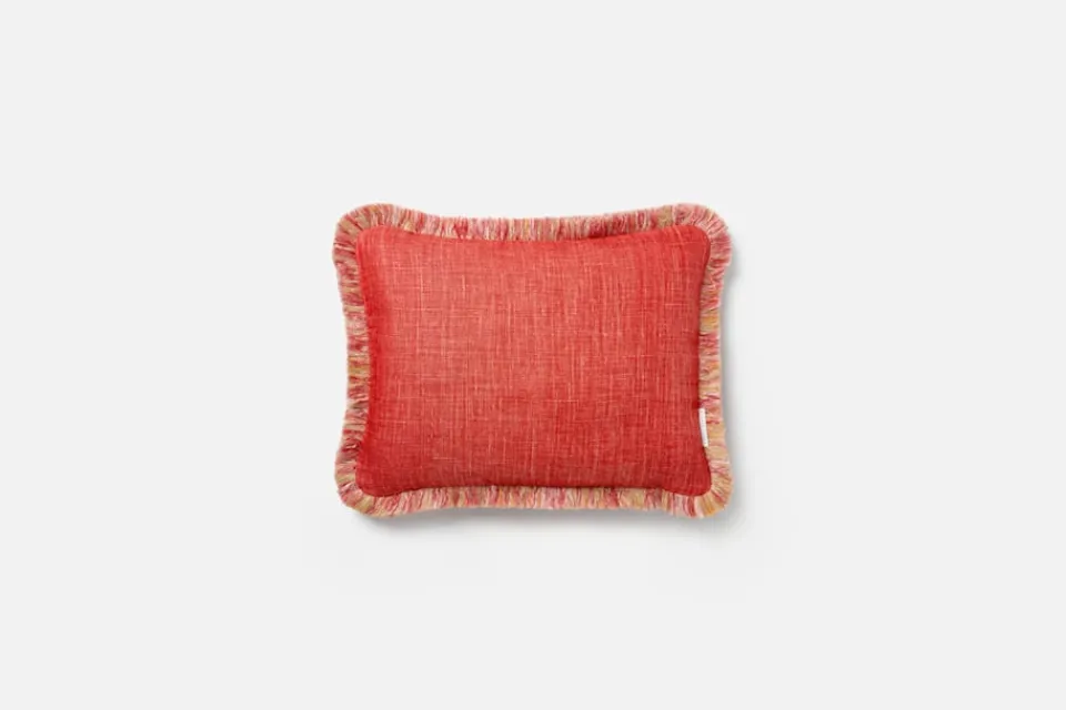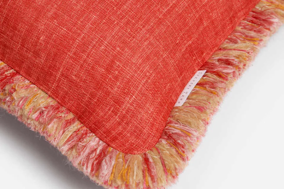 Elegant, rektangulär soffkudde i Svenskt Tenns eget, enfärgade linnetyg i korall med dekorativa fransar. Kudden kan kombineras såväl med enfärgade som mönstrade kuddar och textilier.