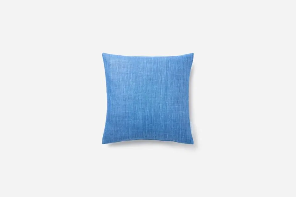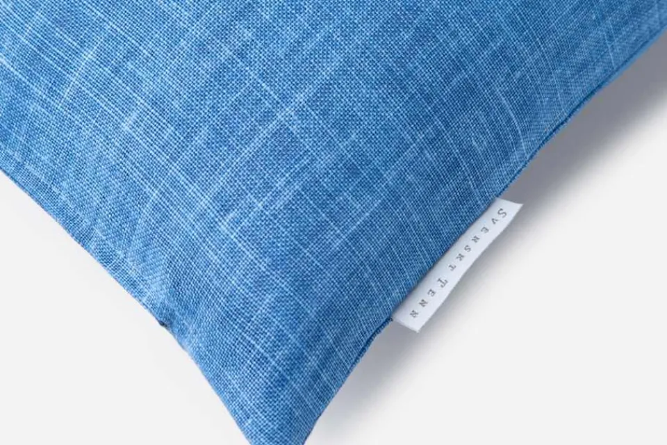 Kudde i Svenskt Tenns eget, enfärgade linnetyg i påfågelblå. Kudden kan kombineras såväl med enfärgade som mönstrade kuddar och textilier.