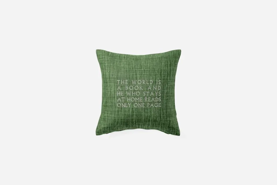 Svenskt Tenns klassiska kuddar är omtyckta världen över; från Stockholm till New York och Shanghai. Estrid Ericson hämtade ofta uppslag och inspiration från litterära miljöer till sina interiörer. Citatet “The World Is a Book and he who stays at home read only one page”, härrör troligen från den helige Augustinus. Detta var ett av Estrid Ericsons favoritcitat, då resor kom att bli en av hennes främsta inspirationskällor.