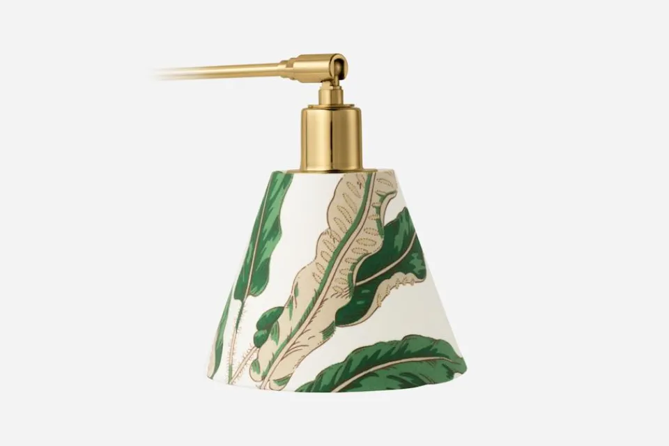 Denna lampskärm är tillverkad i bomullstextilen Stensöta. Svenskt Tenns grundare Estrid Ericson reste mycket till olika platser runt om i världen. Hon letade alltid efter vackra föremål och textilier att ta hem och sälja i butiken på Strandvägen. Textil Stensöta kommer från det engelska textilföretaget GP & J Baker, som i sin formgivning ofta hämtade inspiration från historiska mönstertraditioner. Estrid Ericson började köpa in textil från dem redan under 1930-talet. Det klassiska mönstret Stensöta är den enda textilen från GP & J Baker i Svenskt Tenns sortiment som inte är formgiven av William Turner. Motivet skapades istället av Joseph M Doran, som öppnade sin egen studio i Hounslow i början av 1900-talet. GP & J Baker samarbetade med honom från 1912 till 1936. Stensöta köptes in i januari 1935. Motivet är sprunget ur botaniska ritningar publicerade i Curtis Flora Londinensis mellan 1777 och 1798 (ett register över växter som växer inom en radie på tio mil från London).